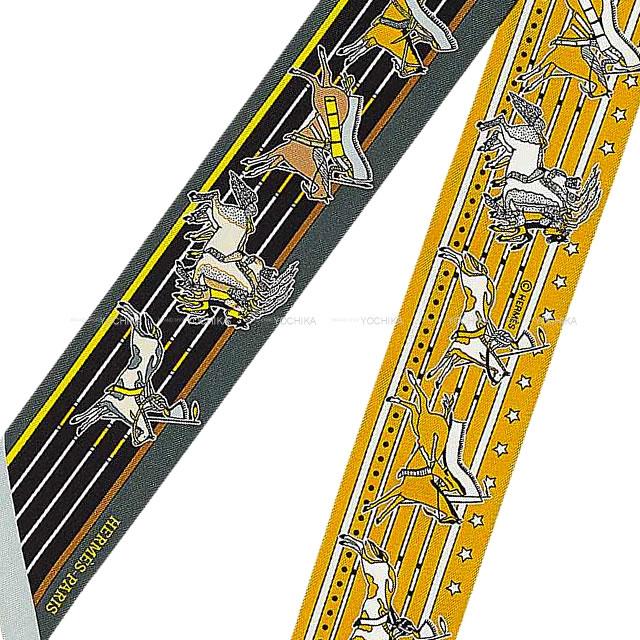 HERMES Twilly Scarf "Pani La Shar Pawnee" Gris anthracite/Gold/Noir(Black) Silk100%[Brand new][Authentic]