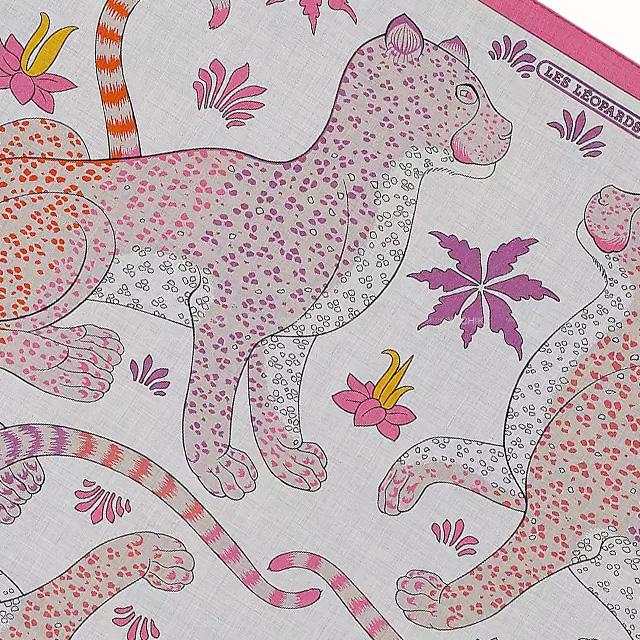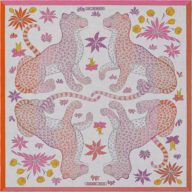 | HERMES エルメス スカーフ カレ140 レオパード グリスシーヌ/ローズ/オレンジ カシミヤ70% / シルク30% 新品 |