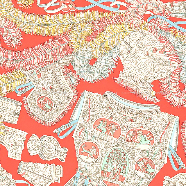 周りの目を惹くエルメスらしいデザイン。眺めているだけでも繊細な技術や模様が楽しめます。使い方は頭に巻けば流行のヘアスタイルに、バッグにつけたり、かごバッグの内布にしたり、風呂敷包みに使ったり、インテリアファブリックにしたり…シンプルなつくりだからこそ万能に使える魅力が詰まったアイテムです。プレゼントにもオススメです。あなたなりのアレンジをお楽しみください。