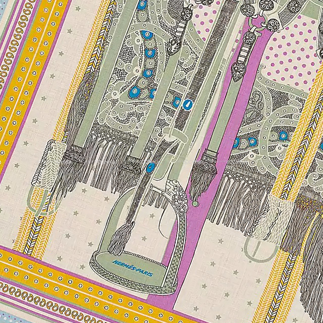 HERMESのカレ140サイズは一般的な90サイズより多彩な使い方ができます!カレやツイリーで展開している「士官の鞍」よりも豪奢な飾り付けがされたサドルをモチーフにしており、よりエレガントに彩る事まちがいなし!こちらの大判スカーフは体を覆うことが出来るので、個性的にトップスとしてアレンジするのがオススメです。肩にかけてみたり、インテリアにしてみたりとアレンジはアナタ次第で自由自在。今回はプレゼントにも喜ばれます。この機会にいかがでしょうか?