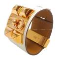 | 存在感抜群のブレスレット、コリエ・ド・シアンが入荷しました!コリエ・ド・シアンと言えば、ヴィクトリア・ベッカムやジェニファー・ロペスなどの、エルメスラバーのセレブリティのスナップでは必ずと言っていいほど目にするアイテム。両者ともシンプルでカッコイイスタイルを好むことで有名ですよね。コリエ・ド・シアンはそんな大人カッコイイスタイルにもってこいのアイテムです。こちらはベーシックなアイボリーカラー「ナタ」にローズゴールドの金具が女性らしさを残しつつハードな印象になりすぎないので、大変合わせやすい一品です!是非この機会をお見逃しなく! |