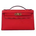 | HERMES Handbag Pochette Kelly Rouge Radieux Veau Swift Gold HW Stamp K[BRAND NEW][Authentic] |
