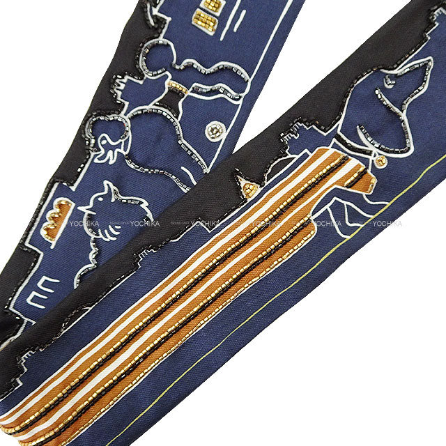 | 2024SS HERMES scarf Twilly Prejoux Parisian Dog Marin/Caramel/Mordor Silk100%/Lambskin/Beads[BRAND NEW][Authentic] |