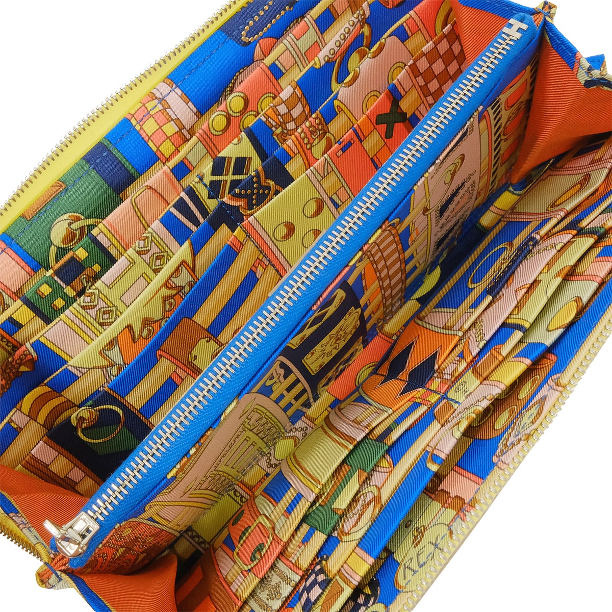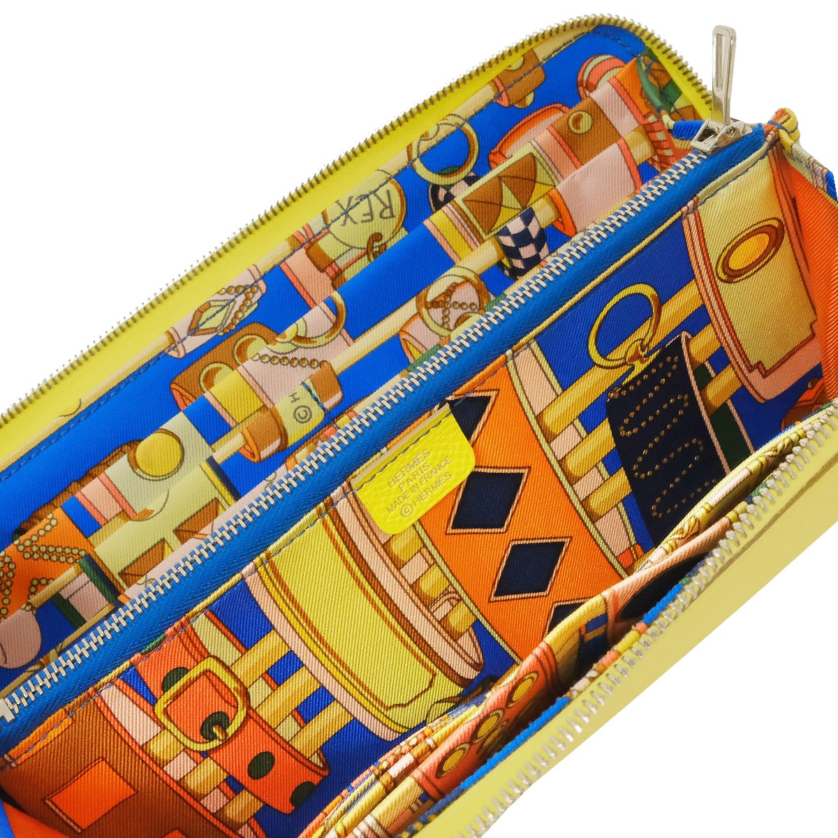 | エルメスを代表する長財布「アザップ シルクイン」です。外装は数あるエルメスのカラーバリエーションの中でも、パッと目を引く鮮やかで上品なイエロー系「ライム」。そして内側のシルクに描かれているのは、1920年代から続くエルメスの不朽の名作「コリエ・ド・シアン(犬の首輪)」が施された、非常にファンの多い逸品です。バッグから取り出すたびに気分が上がるビタミンカラーと、開けた瞬間に広がるシックなシルク柄。外側のライムとのドラマチックなコントラストはまさに芸術品です。 |
