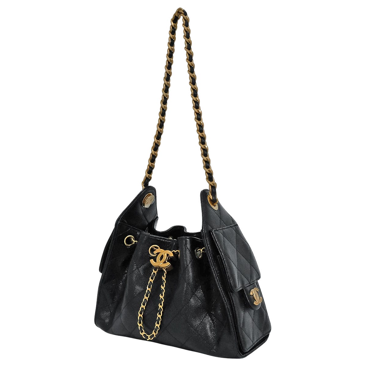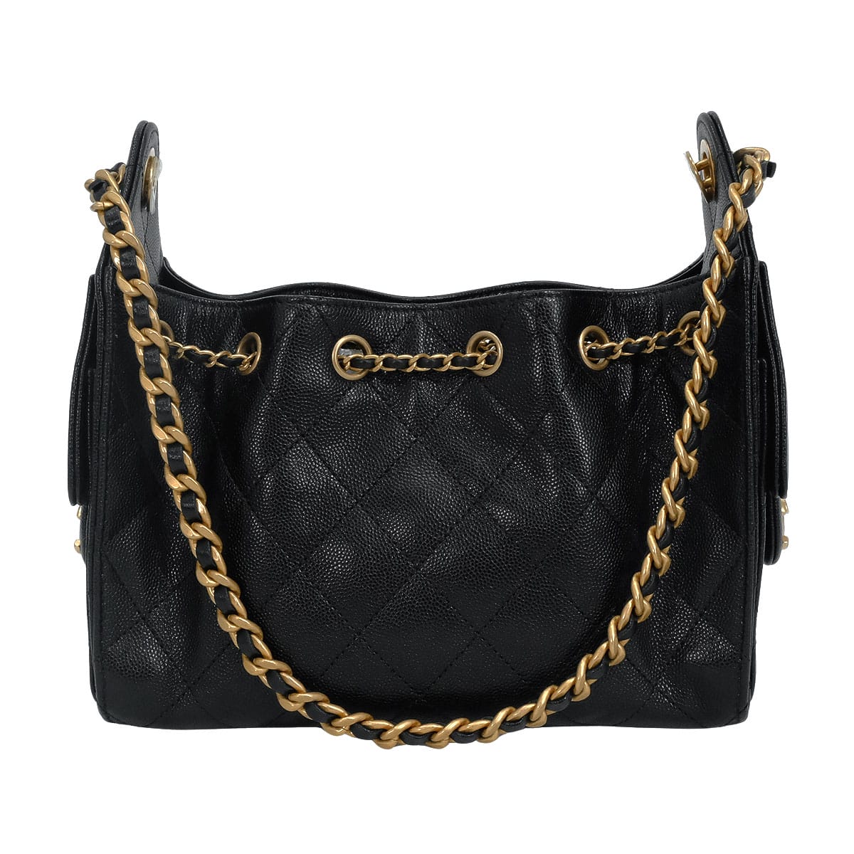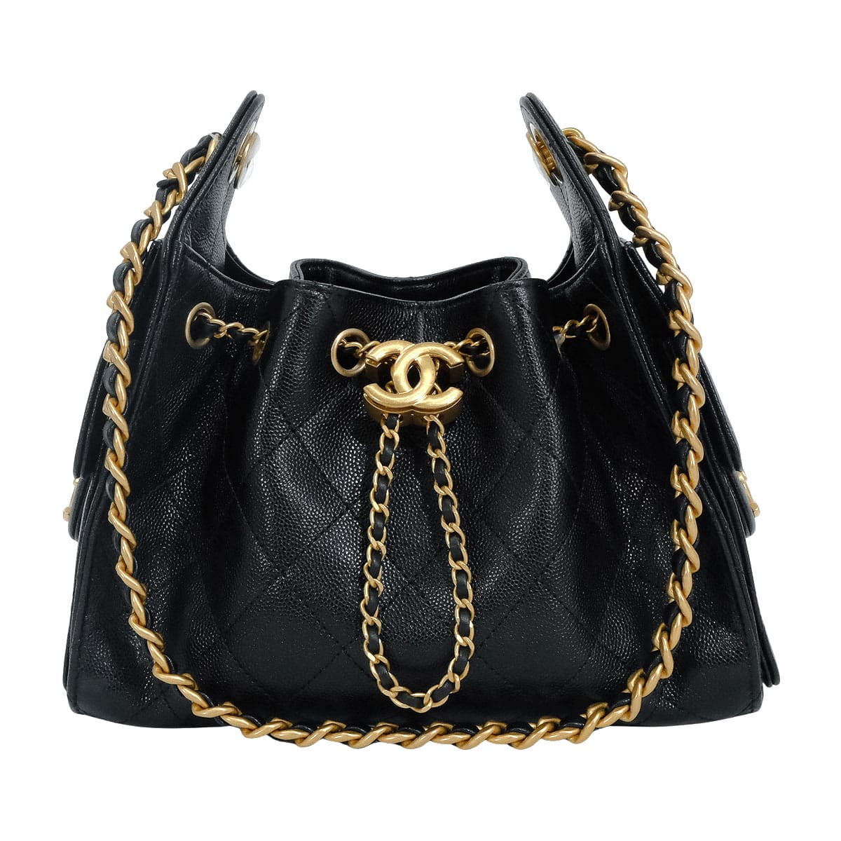 | The Chanel Drawstring Bag has arrived in iconic black caviar skin accented with antique matte gold hardware. Crafted from durable grained calfskin, this masterpiece features a CC logo stopper and elegant dangling chains that bring a sense of prestige to its charming silhouette. Its compact yet functional design makes it an ideal companion for any occasion, from daily outings to formal events. We invite you to experience this timeless symbol of Chanel elegance that represents an enduring investment in style. |