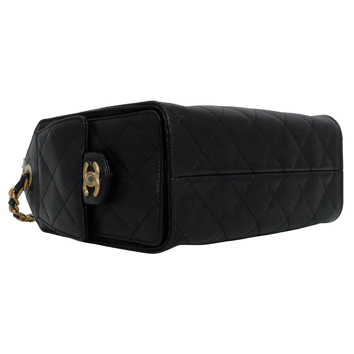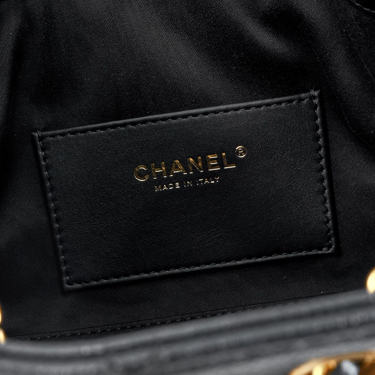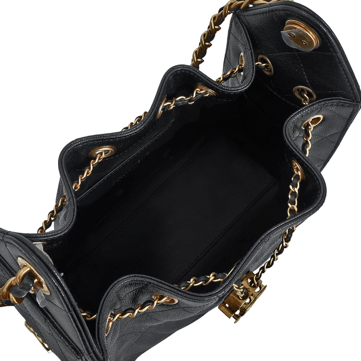 | The Chanel Drawstring Bag has arrived in iconic black caviar skin accented with antique matte gold hardware. Crafted from durable grained calfskin, this masterpiece features a CC logo stopper and elegant dangling chains that bring a sense of prestige to its charming silhouette. Its compact yet functional design makes it an ideal companion for any occasion, from daily outings to formal events. We invite you to experience this timeless symbol of Chanel elegance that represents an enduring investment in style. |