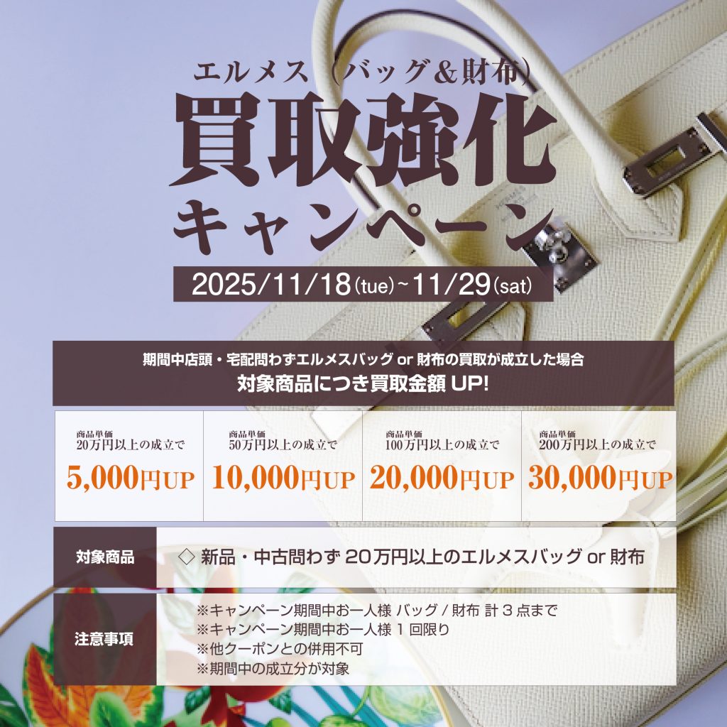 さて、今年も残すところあと約1カ月。毎年この時期になると「もう一年終わりか~早いな~」とお思いになる方々はいらっしゃいますでしょうか。年末が近づくと、ついお片付けや断捨離をしてしまうもので、ただいまブランドショップよちかでは、エルメスバッグ&お財布買取強化キャンペーンを行っております(11月29日買取成立分まで)。